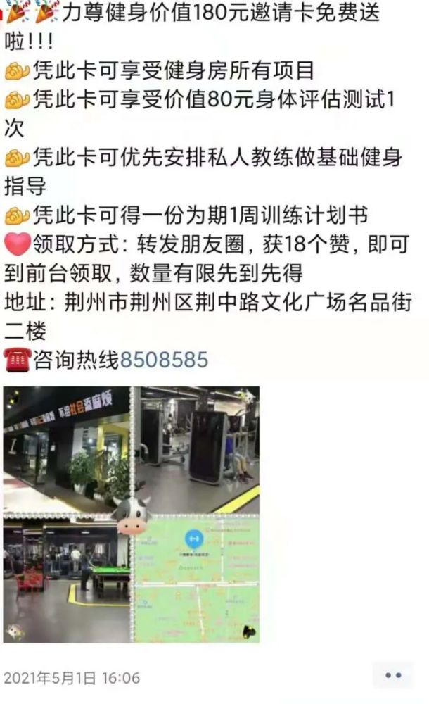 而在2021年5月,在小编的朋友圈还有人在发立尊健身的推广信息,表示免费赠送180元的邀请卡,还有转发的活动。
